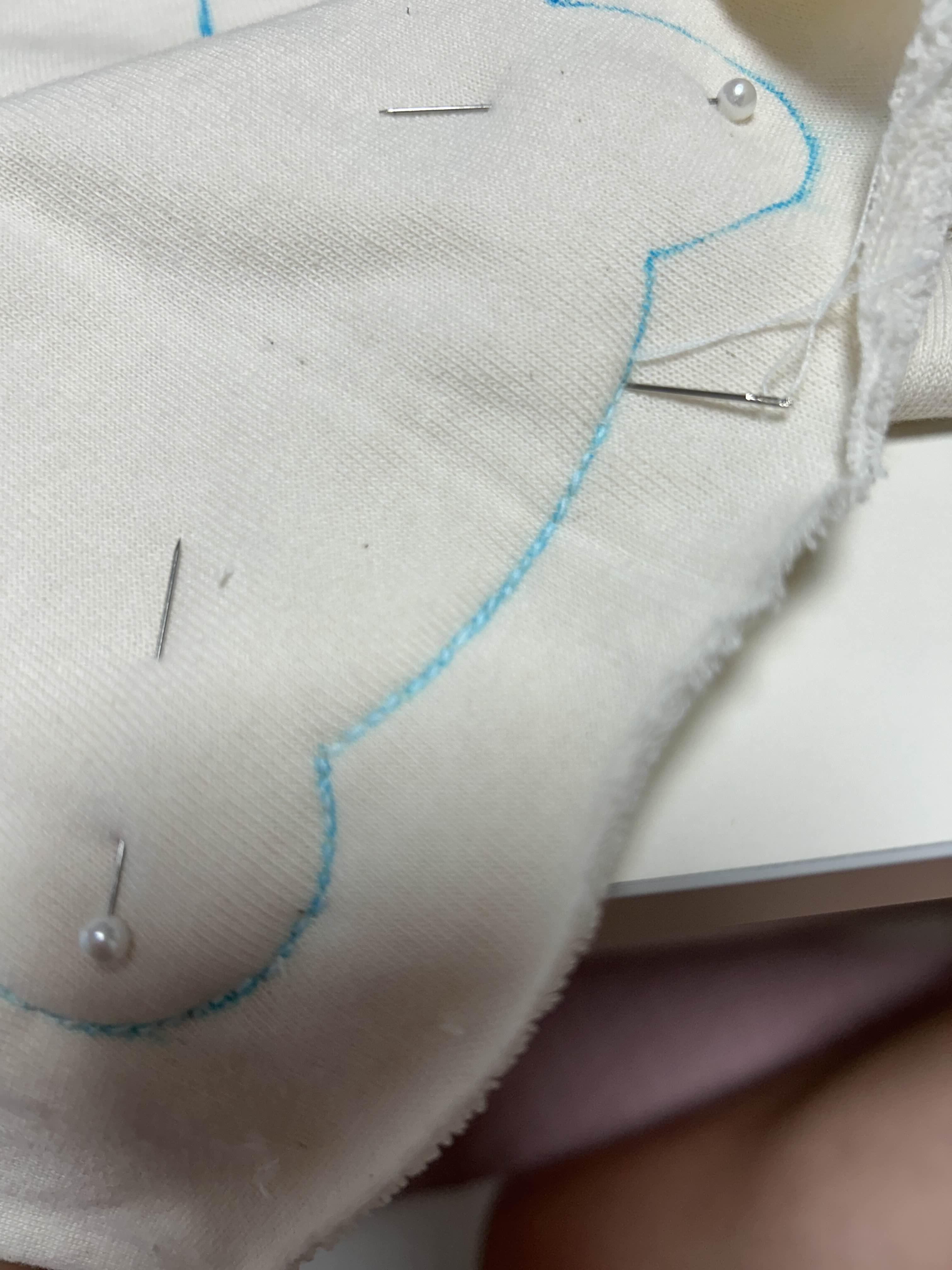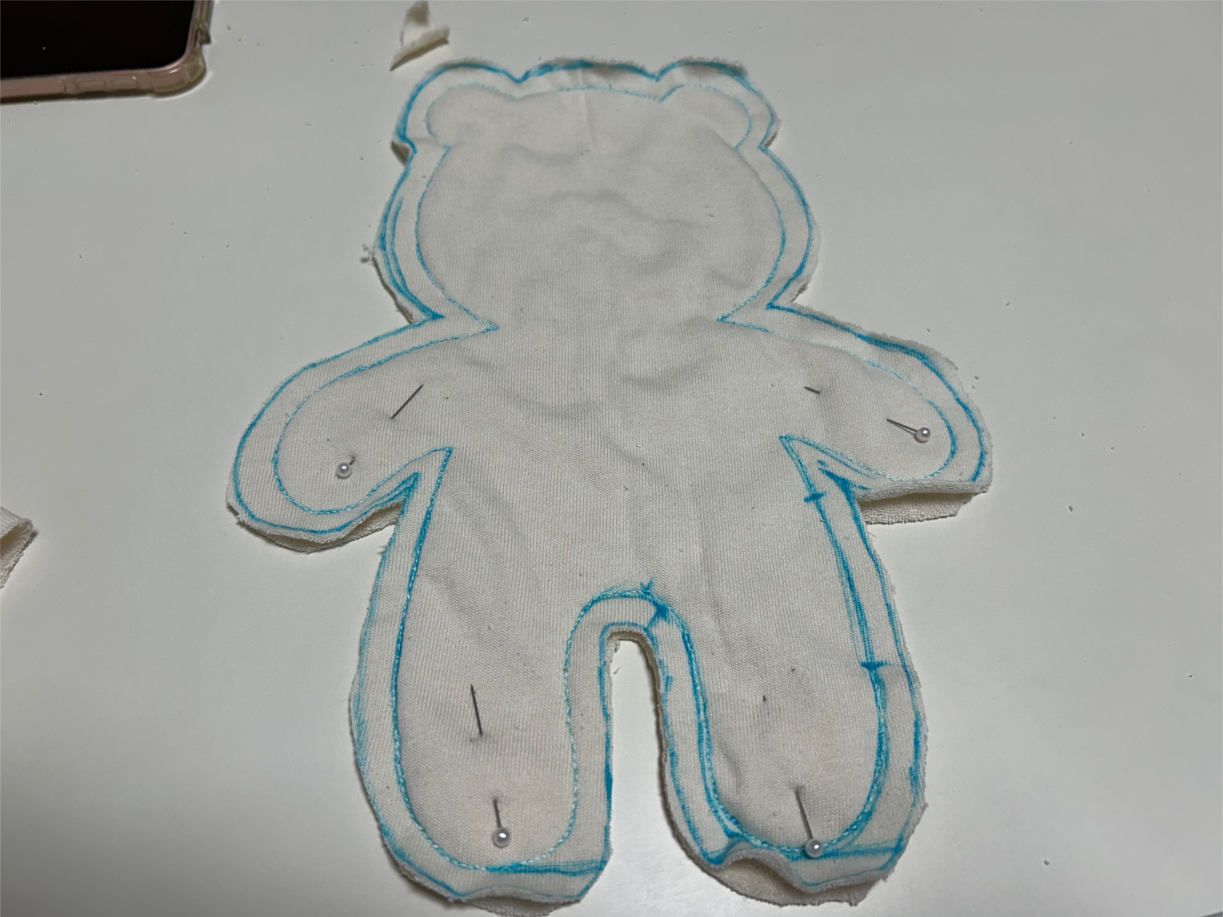 잘라낸 곰돌이를 대고 원단용펜으로 바느질 선을 그려준다
