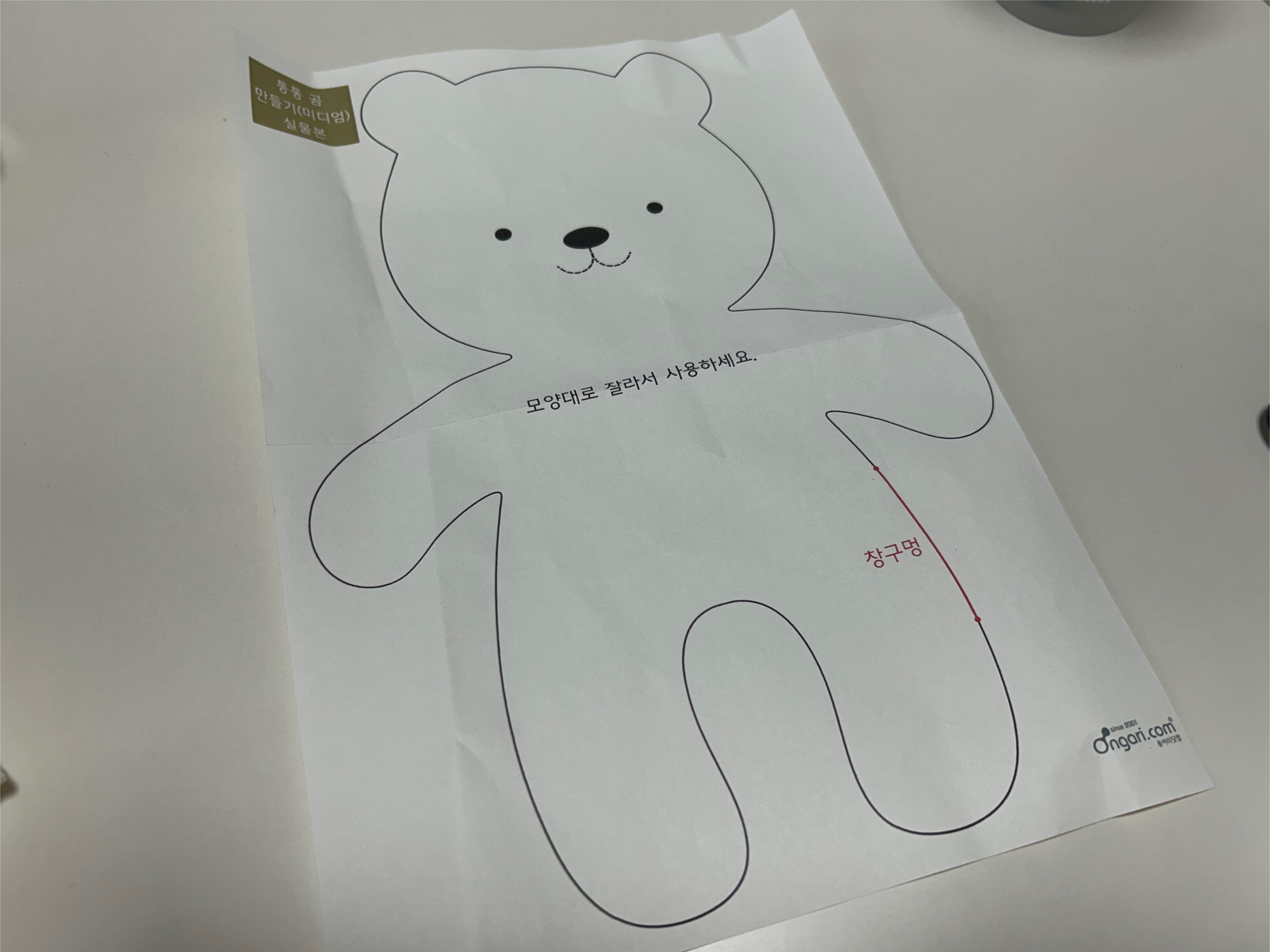 종이에 그려진 곰돌이를 곰돌이 모양대로 잘라요